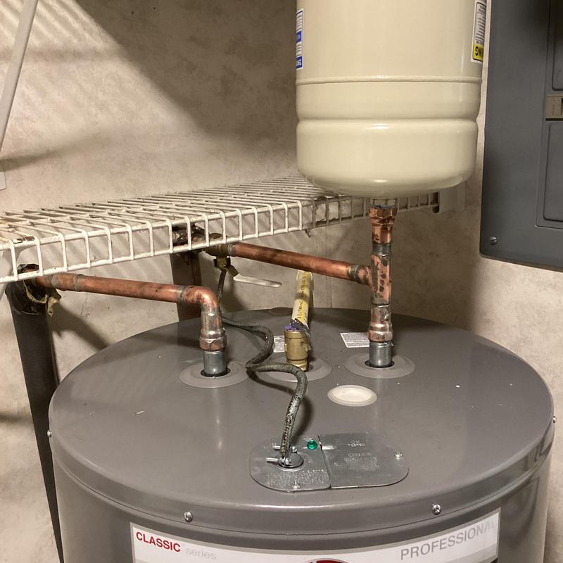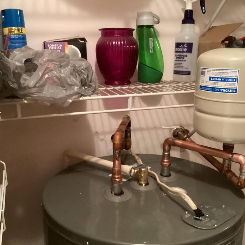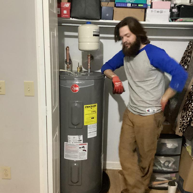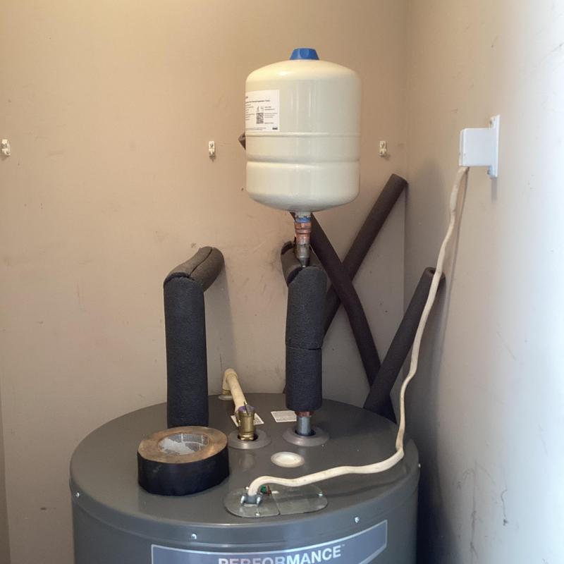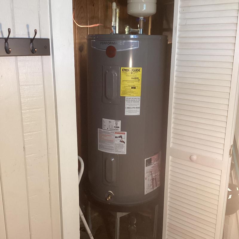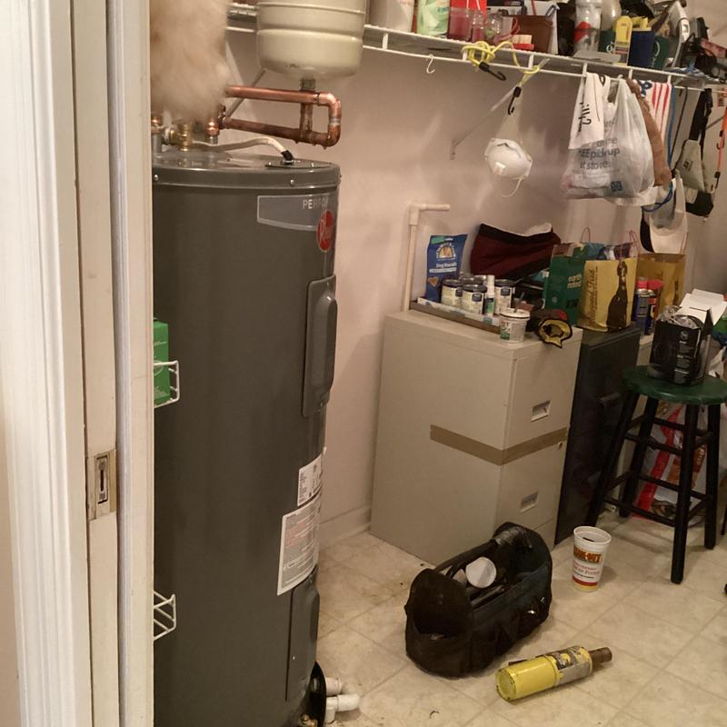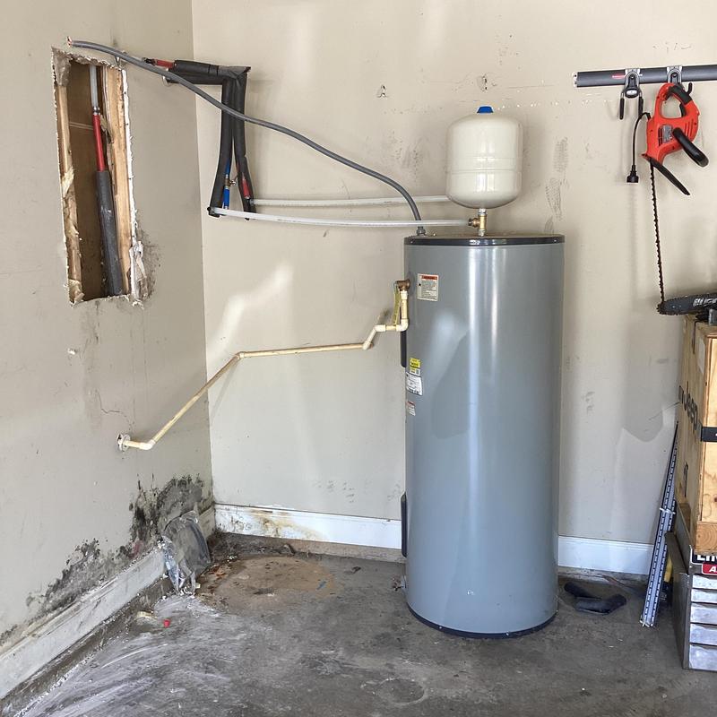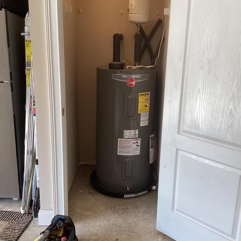 Dean Plumbing and Gas Piping replaced a 50-gallon electric water heater in a garage closet in Huntsville, Alabama. The team installed a new heater in a pan with a shutoff valve, expansion tank, and insulated pipes. They connected it to existing copper and CPVC lines. All materials were provided, and testing showed no leaks.