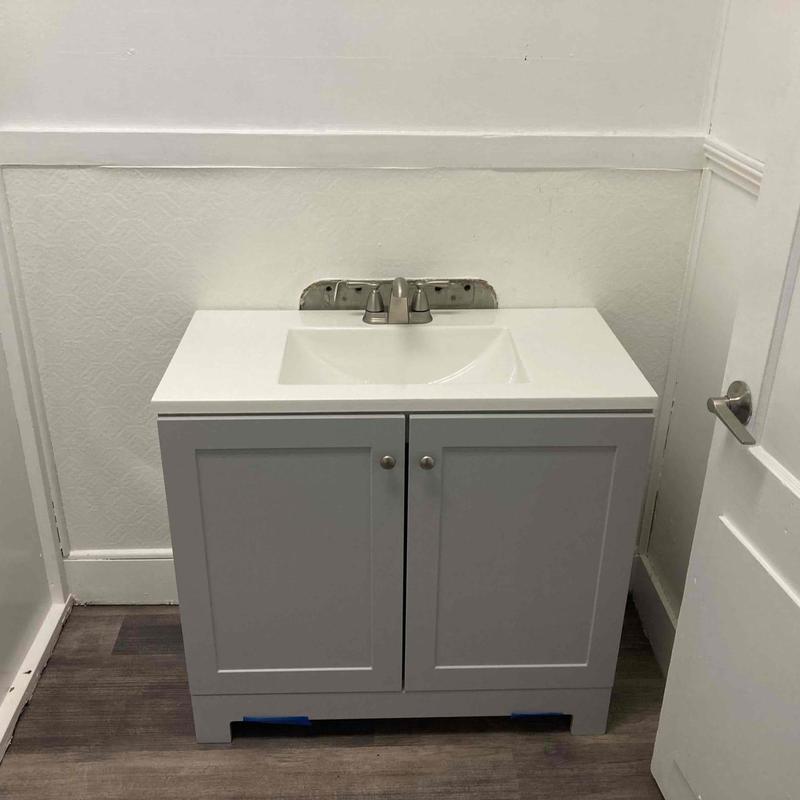 Dean Plumbing and Gas Piping installed a customer-supplied vanity and faucet in Huntsville, Alabama. The project included modifying drainage, replacing a leaking shower valve, reworking water lines, and installing a 38-gallon low-boy water heater under countertops. All plumbing connections were tested and confirmed leak-free. Dean Plumbing provided all materials except the vanity and faucet.