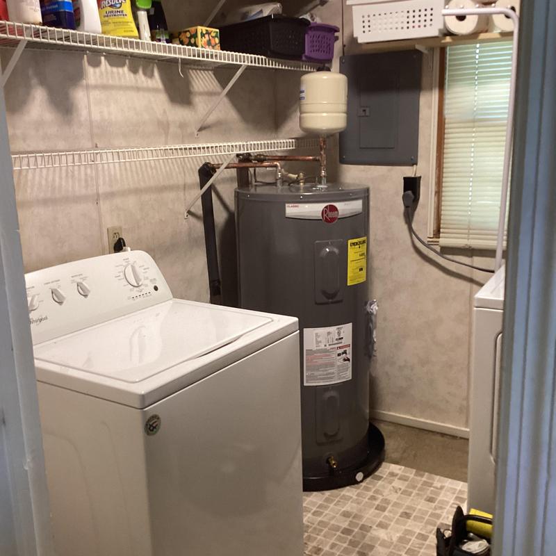 Dean Plumbing and Gas Piping replaced a leaking 13-year-old water heater in a utility room in Huntsville, Alabama. Technicians installed a new 50-gallon electric water heater with a new drain pan, expansion tank, and ball valve. All materials were supplied, and the system was tested to confirm there were no active leaks.