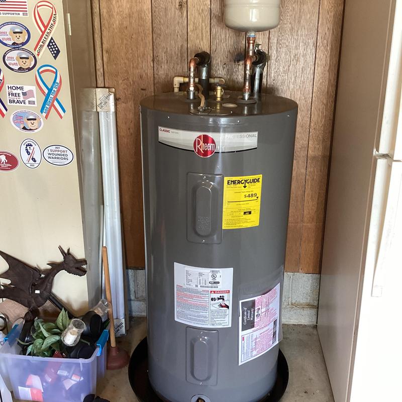 Dean Plumbing and Gas Piping replaced a 50-gallon electric water heater in a garage in Huntsville, Alabama. The team installed a new unit with a drain pan, expansion tank, and copper fittings. They tested the system to ensure proper operation and confirmed there were no leaks. All parts were included, and the work is guaranteed for one year.