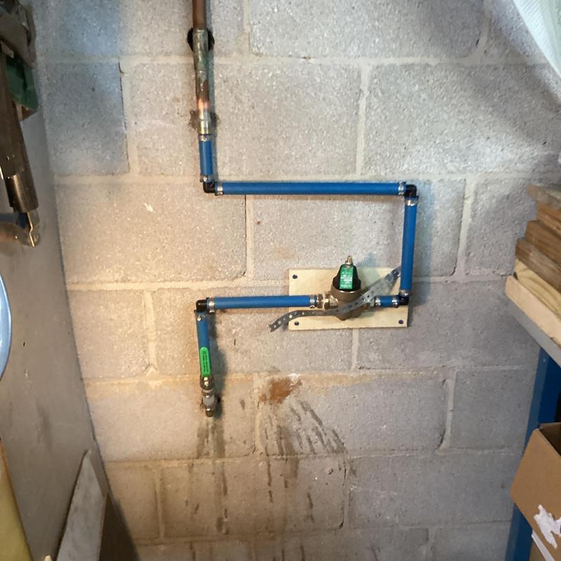 Dean Plumbing and Gas Piping installed a pressure-reducing valve (PRV) in a residential garage in Huntsville, Alabama. The technician connected the PRV to existing copper lines using lead adapters and secured the unit to wood strapping. The system passed testing with no leaks and includes a 90-day workmanship guarantee.