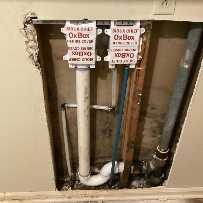 Dean Plumbing and Gas Piping completed plumbing fixture replacements in Huntsville, Alabama. The work included replacing a washing machine supply box, trap, water supply connections, and drywall access. Technicians also installed two toilets, two lavatory faucets, new water shutoff valves, and P-traps. All components were tested for proper function after installation.