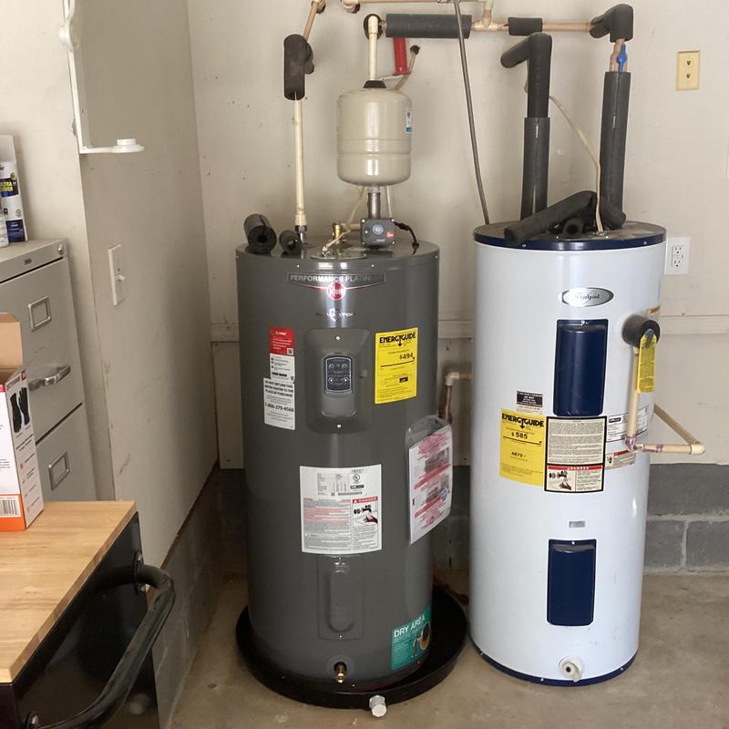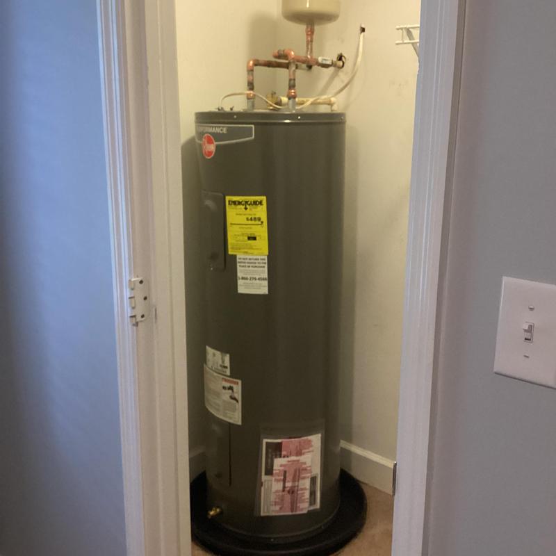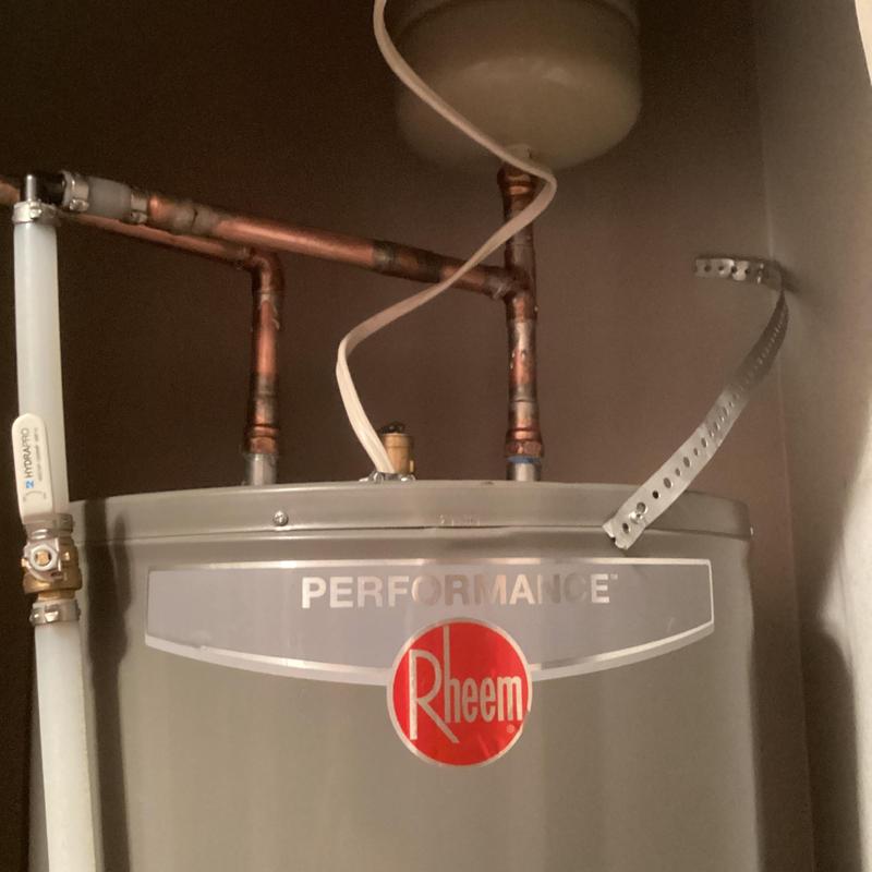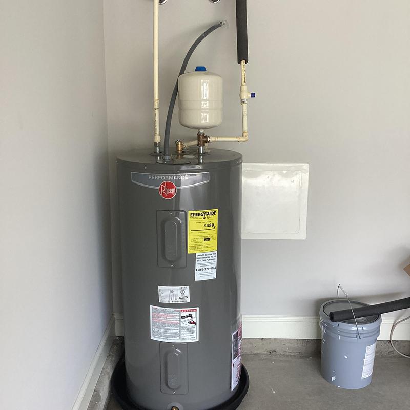 Dean Plumbing and Gas Piping installed a 50-gallon electric water heater in a utility room in Huntsville, Alabama. They connected it to existing copper water lines and a CPVC drain, installed an expansion tank and drain pan, insulated the hot line, and tested the system. They also replaced toilet parts in a master bathroom.