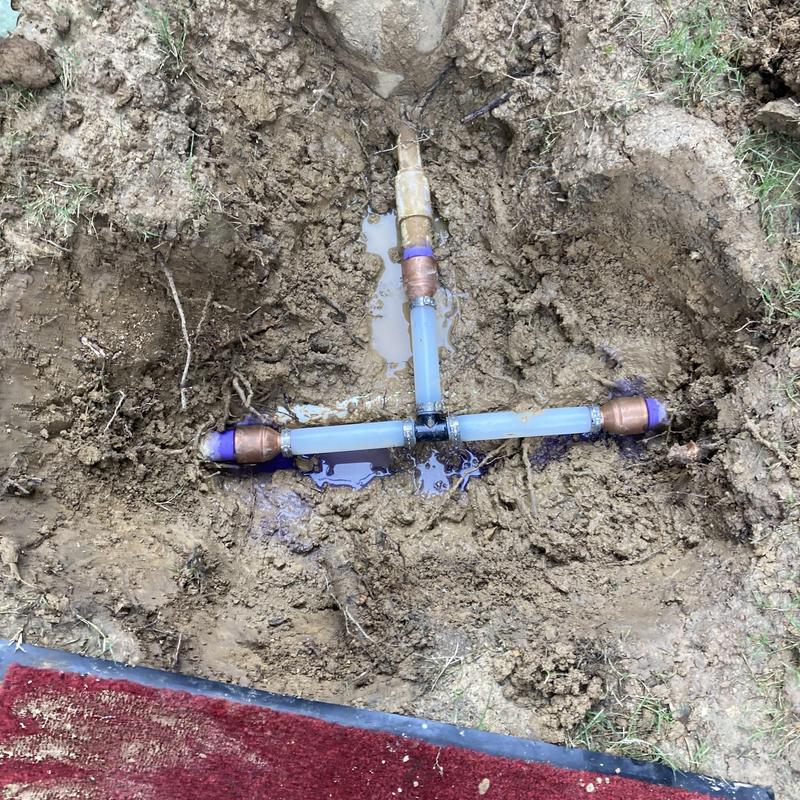 Dean Plumbing and Gas Piping removed a tree root interfering with a water line in Huntsville, Alabama. They excavated both sides of a leaking tee, replaced a damaged 1-inch fitting with new PEX piping, and restored the water line. This work ensured proper flow and prevented further leakage.