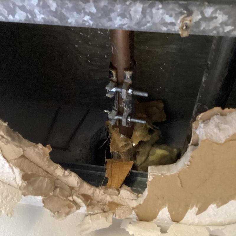 DEAN PLUMBING and GAS PIPING replaced a damaged 3-foot copper water line in a hotel ceiling. The crew isolated the line on the 5th floor, removed the old section, and installed a new copper pipe using pro press fittings. This work restored hot water quickly in Huntsville, Alabama.