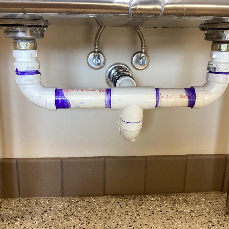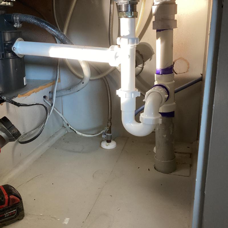 Dean Plumbing and Gas Piping replaced both basket strainers and repiped the sink drain using 1.5" PVC with new adapters, a union P-trap, and Fernco fittings. This improvement allows easier future access for maintenance. All materials were provided. Work was completed in Huntsville, Alabama, and tested with no leaks.