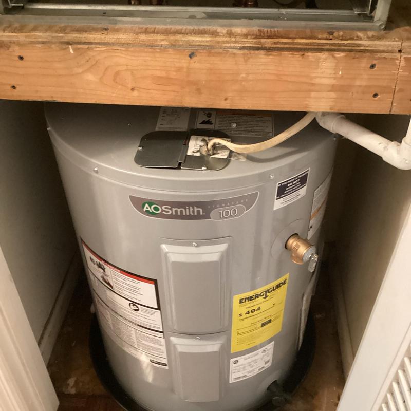 Dean Plumbing and Gas Piping replaced a 40-gallon electric water heater in the foyer closet beneath an HVAC system in Huntsville, Alabama. The team installed a customer-supplied AO Smith unit, connected it to existing copper lines, removed air from the system, and restored power. Installation includes a one-year labor warranty.