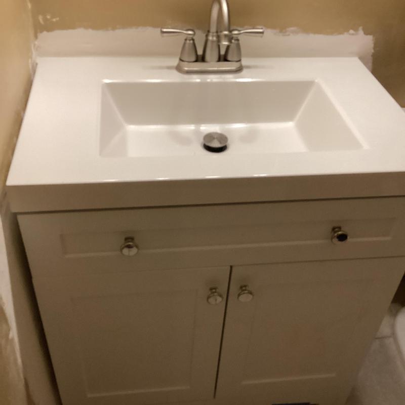 Dean Plumbing and Gas Piping installed a customer-supplied vanity and faucet in Huntsville, Alabama. The project included modifying drainage, replacing a leaking shower valve, reworking water lines, and installing a 38-gallon low-boy water heater under countertops. All plumbing connections were tested and confirmed leak-free. Dean Plumbing provided all materials except the vanity and faucet.