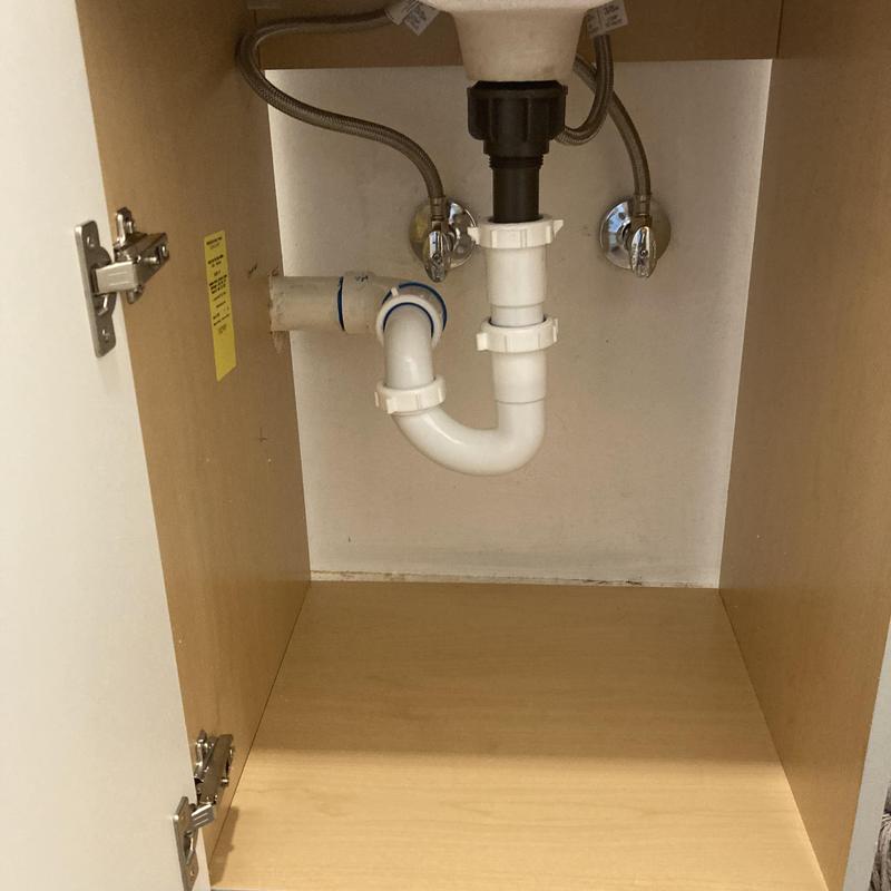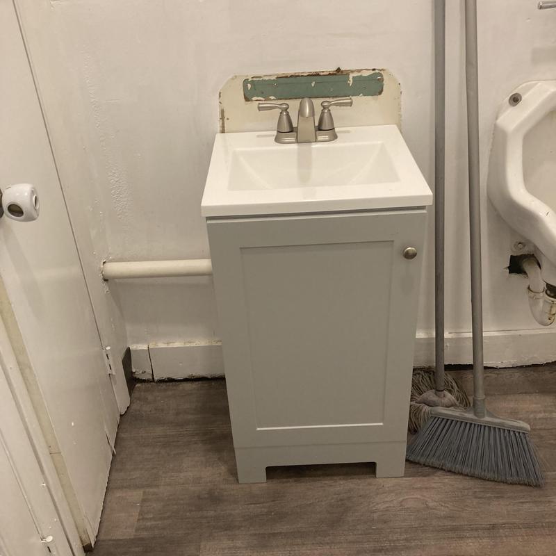 Dean Plumbing and Gas Piping installed a new Liberty pump and basin under a kitchen sink in Huntsville, Alabama. They corrected venting, added check and ball valves, and tested the system. The team also installed a customer-provided vanity with faucet, replaced wall drain and angle stops, and capped lines behind a removed drinking fountain.
